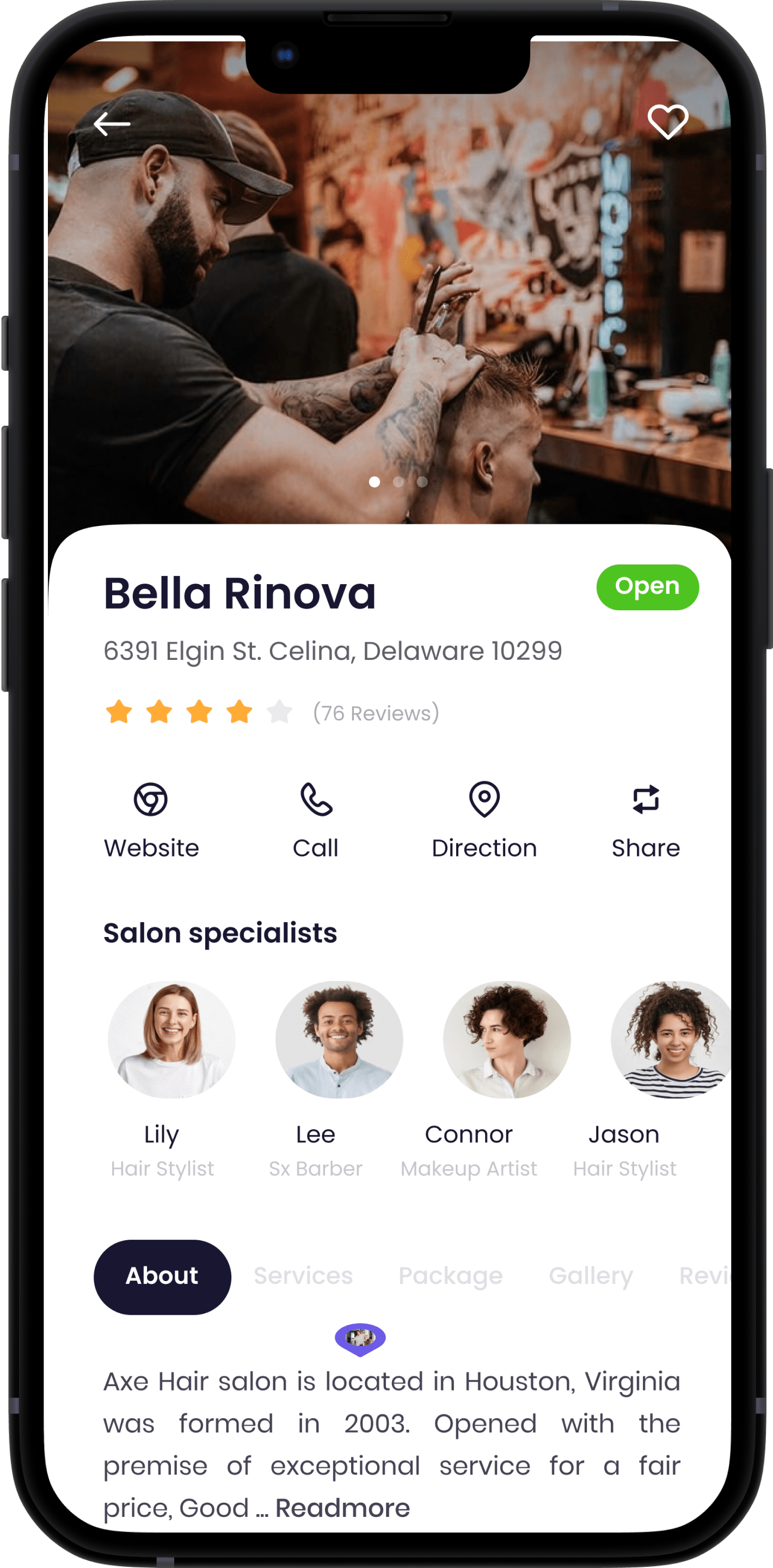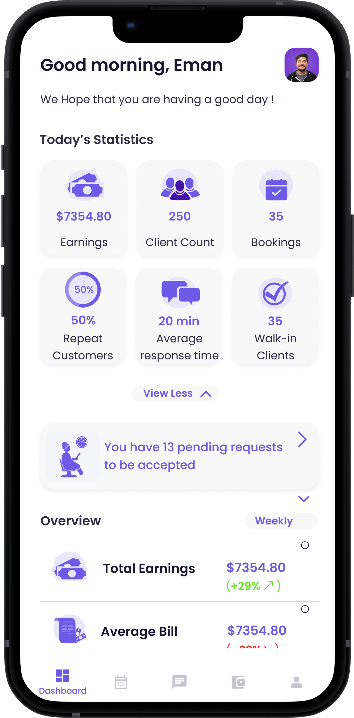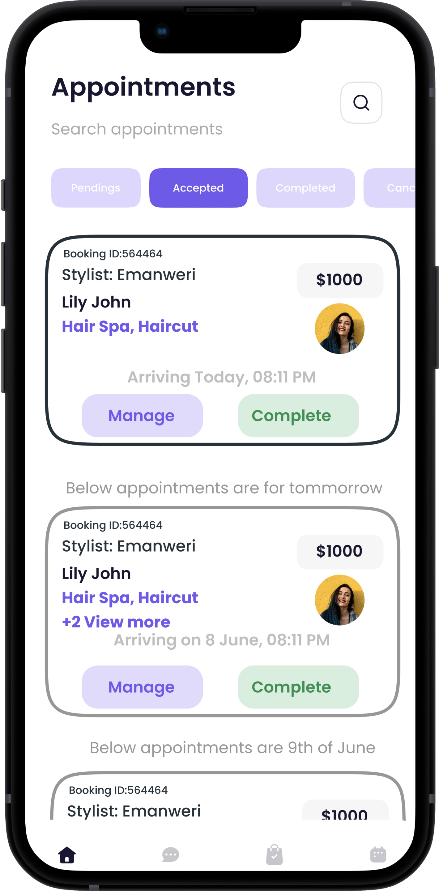 A business dashboard for ultimate control. They can craft detailed profiles showcasing services, pricing, staff expertise, and stunning salon photos to attract clients. The dashboard empowers them to manage appointments, schedules, and accept online payments, streamlining business operations and maximizing efficiency.