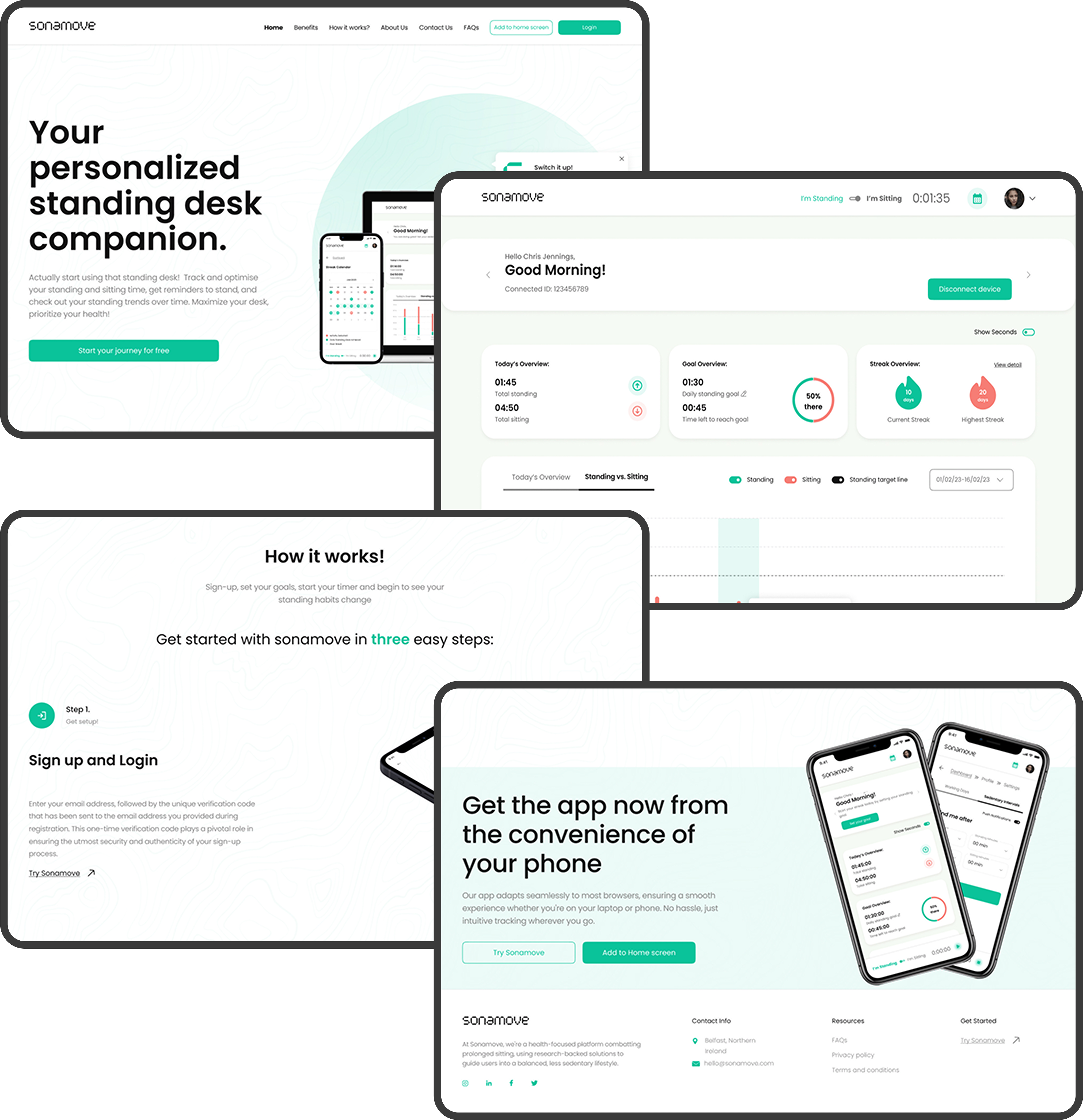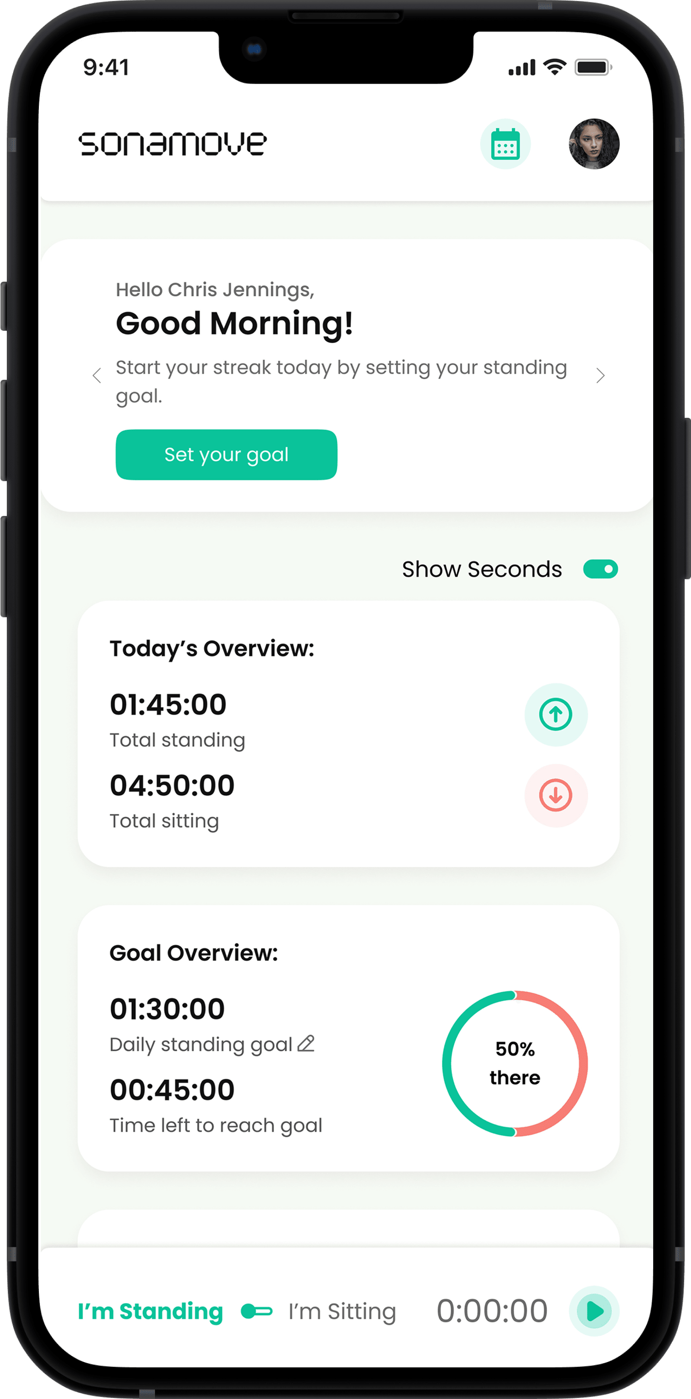 Sonamove was designed to cater to remote workers, freelancers, and professionals looking for a simple yet effective way to track their sitting and standing habits. Through user testing and feedback, the app was refined to ensure accessibility and ease of use for a diverse audience.
