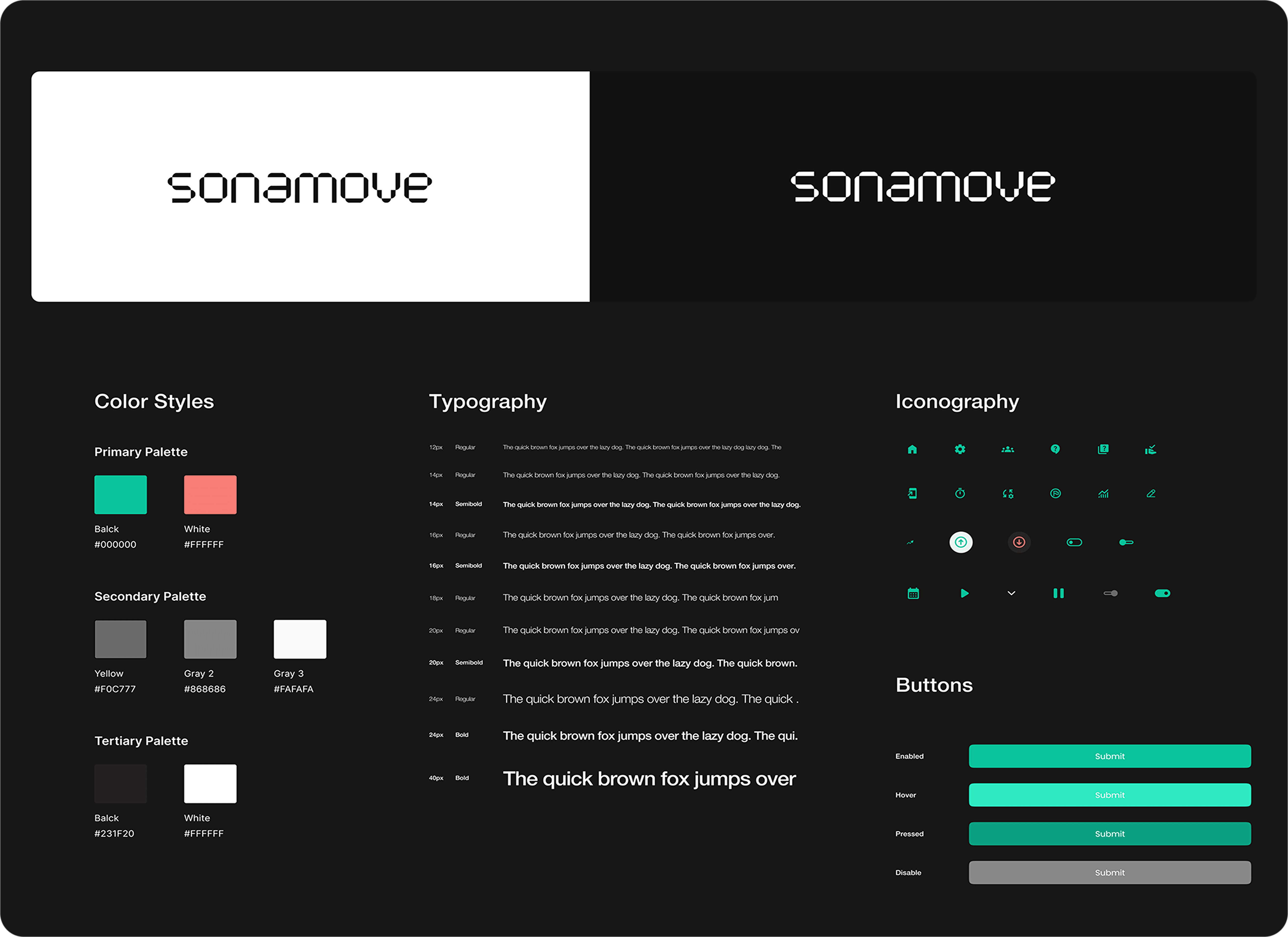The visual identity of Sonamove was crafted to reflect its mission of promoting an active lifestyle. The color palette, typography, and UI components were chosen to create a fresh, modern, and energetic feel, ensuring an intuitive and engaging user experience.